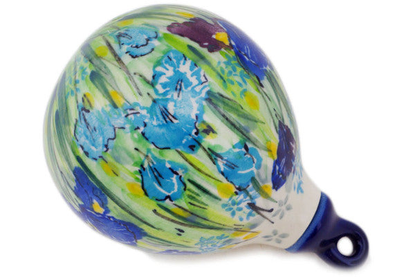 This Polish pottery Christmas Ball Ornament is made by Ceramika Artystyczna workshop in Boleslawiec, Poland. Manufacturer item number H2492Q. It is 4" high and measures 2¾" by 2¾". The weight of this Christmas Ball Ornament is 0.2 lbs. The pattern was designed by artist MARIA STARZYK. It is part of the Iris Field Collection.