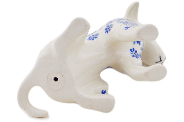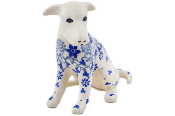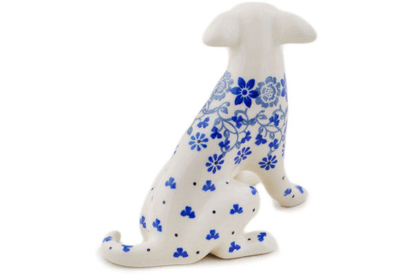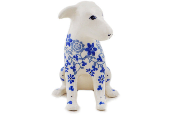 This Polish pottery Dog Figurine is made by Ceramika Artystyczna workshop in Boleslawiec, Poland. Manufacturer item number H0353Q. It is 4½" high and measures 4½" by 2½". The weight of this Dog Figurine is 0.4 lbs. The pattern was designed by artist Maria Starzyk. It is part of the Blue Country Field Collection.
