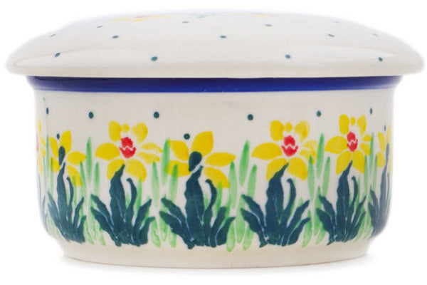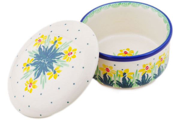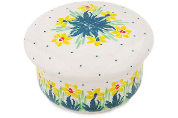 This Polish pottery Jar with Lid is made by Ceramika Artystyczna workshop in Boleslawiec, Poland. Manufacturer item number H1261K. It is 2¼" high and measures 4" by 4". The weight of this Jar with Lid is 0.7 lbs. It is part of the Summer Meadow Collection.