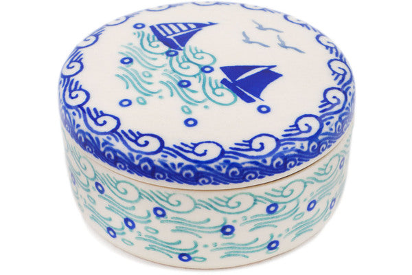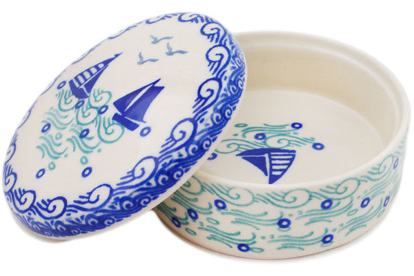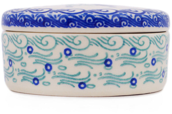 This Polish pottery Jewelry Box is made by Ceramika Artystyczna workshop in Boleslawiec, Poland. Manufacturer item number H1091R. It is 1¾" high and measures 3¾" by 3¾". The capacity of this Jewelry Box is 3.5 oz when filled to rim and it weighs 0.6 lbs.