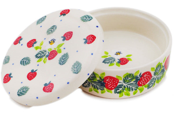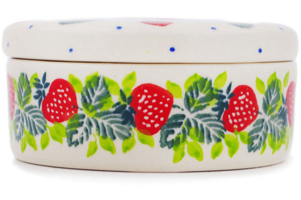 This Polish pottery Jewelry Box is made by Ceramika Artystyczna workshop in Boleslawiec, Poland. Manufacturer item number H1043R. It is 1¾" high and measures 3¾" by 3¾". The capacity of this Jewelry Box is 3.5 oz when filled to rim and it weighs 0.6 lbs. It is part of the Berry Burst Collection.