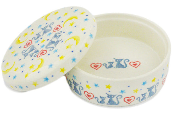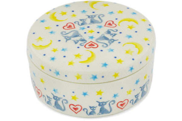 This Polish pottery Jewelry Box is made by Ceramika Artystyczna workshop in Boleslawiec, Poland. Manufacturer item number H1339R. It is 1¾" high and measures 3¾" by 3¾". The capacity of this Jewelry Box is 3.5 oz when filled to rim and it weighs 0.6 lbs. The pattern was designed by artist Wirginia Cebrowska. It is part of the Kittens Of The Heart Collection.