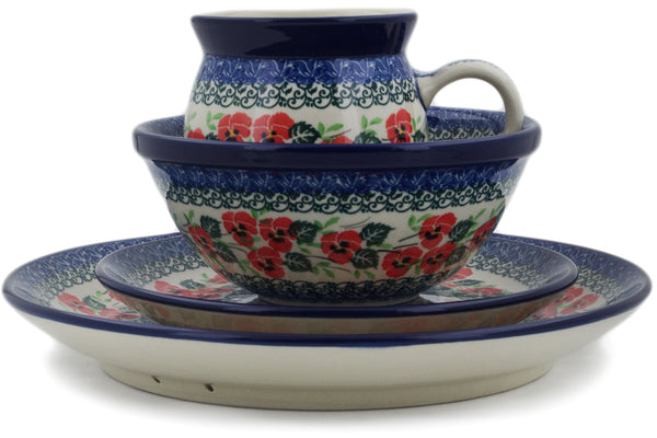 This Polish pottery Place Setting is made by Ceramika Artystyczna workshop in Boleslawiec, Poland. Manufacturer item number H0739L. It is 4" high and measures 10½" by 10½". The capacity of this Place Setting is 24.0 oz when filled to rim and it weighs 5.5 lbs. It is part of the Delicate Red Flowers Collection.