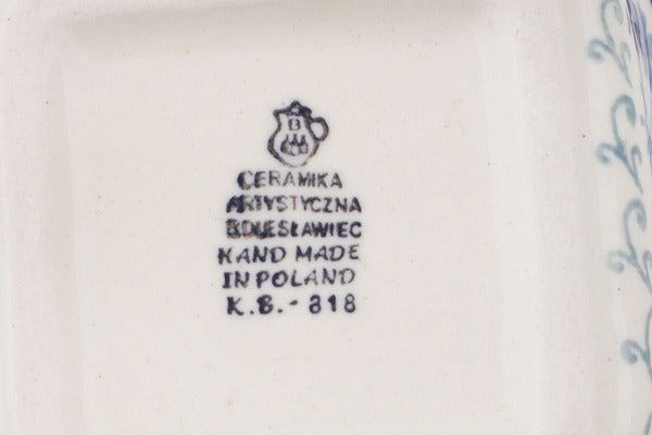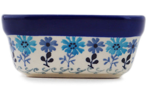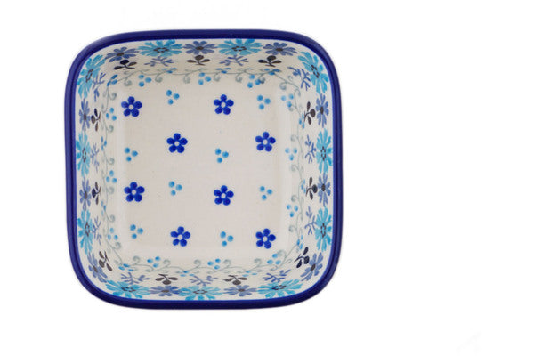 This Polish pottery Square Bowl is made by Ceramika Artystyczna workshop in Boleslawiec, Poland. Manufacturer item number H6446Q. It is 1¾" high and measures 4" by 4". The capacity of this Square Bowl is 6.8 oz when filled to rim and it weighs 0.5 lbs. It is part of the Baby Blue Garden Collection.