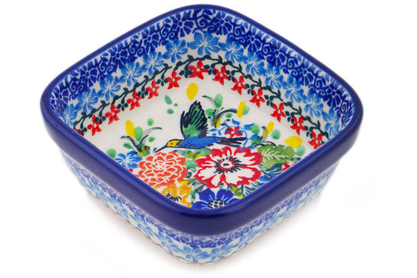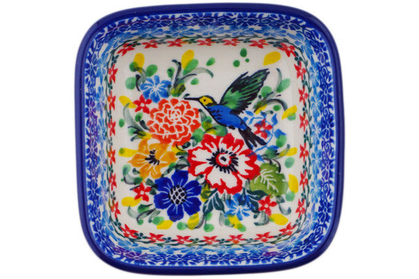 Polish Pottery 4" Square Bowl Hummingbird Meadow UNIKAT