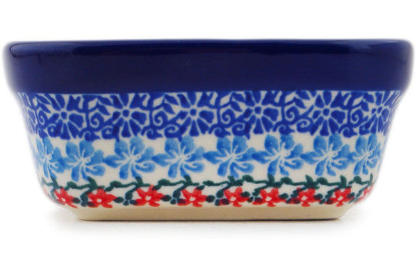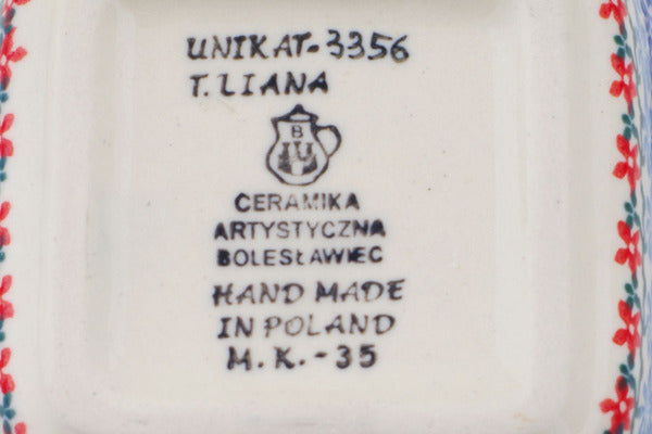 This Polish pottery Square Bowl is made by Ceramika Artystyczna workshop in Boleslawiec, Poland. Manufacturer item number H6749Q. It is 1¾" high and measures 4" by 4". The capacity of this Square Bowl is 6.8 oz when filled to rim and it weighs 0.5 lbs. The pattern was designed by artist Teresa Liana. It is part of the Hummingbird Meadow Collection.