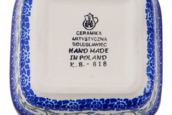 This Polish pottery Square Bowl is made by Ceramika Artystyczna workshop in Boleslawiec, Poland. Manufacturer item number H5664Q. It is 1¾" high and measures 4" by 4". The capacity of this Square Bowl is 6.8 oz when filled to rim and it weighs 0.5 lbs. The pattern was designed by artist Maria Starzyk. It is part of the Petite Blue Vine Collection.