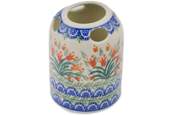 This Polish pottery Toothbrush Holder is made by Ceramika Artystyczna workshop in Boleslawiec, Poland. Manufacturer item number H5504Q. It is 4" high and measures 3¼" by 3¼". The weight of this Toothbrush Holder is 0.4 lbs. The pattern was designed by artist Jolanta Okraska. It is part of the Crimson Bells Collection.