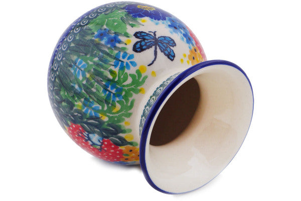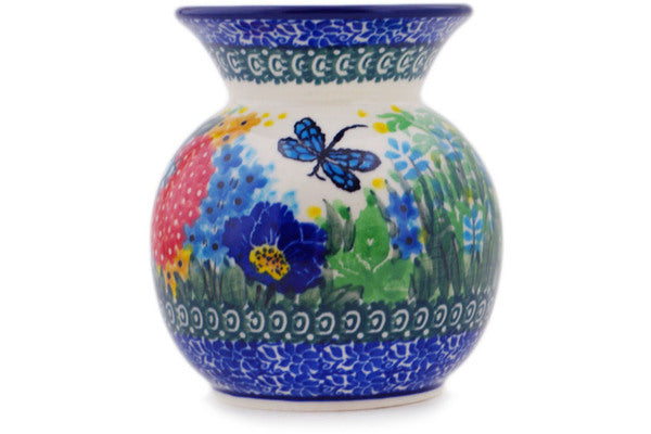 This Polish pottery Vase is made by Ceramika Artystyczna workshop in Boleslawiec, Poland. Manufacturer item number H6901Q. It is 4¼" high and measures 4" by 4". The weight of this Vase is 0.7 lbs. The pattern was designed by artist Teresa Liana. It is part of the Dragonfly Delight Collection.