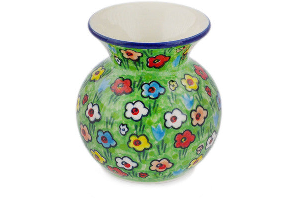This Polish pottery Vase is made by Ceramika Artystyczna workshop in Boleslawiec, Poland. Manufacturer item number H3196R. It is 3¾" high and measures 3½" by 3½". The weight of this Vase is 0.5 lbs. It is part of the Whimsical Garden Collection.