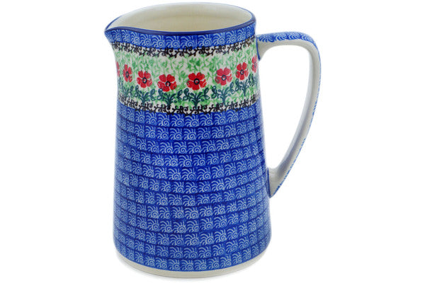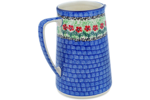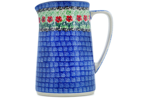 This Polish pottery Pitcher is made by Ceramika Artystyczna workshop in Boleslawiec, Poland. Manufacturer item number H7879P. It is 7¼" high and measures 6¼" by 5". The capacity of this Pitcher is 44.7 oz when filled to rim and it weighs 2.0 lbs. The pattern was designed by artist Irena Mączka. It is part of the Maraschino Collection.