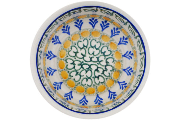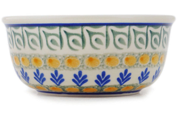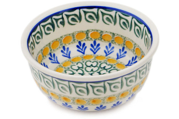 This Polish pottery Bowl is made by Ceramika Artystyczna workshop in Boleslawiec, Poland. Manufacturer item number H5341Q. It is 2¼" high and measures 5" by 5". The capacity of this Bowl is 11.0 oz when filled to rim and it weighs 0.6 lbs. The pattern was designed by artist Anna Pasierbiewicz. It is part of the Autumn Wheatfields Collection.