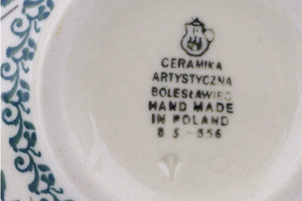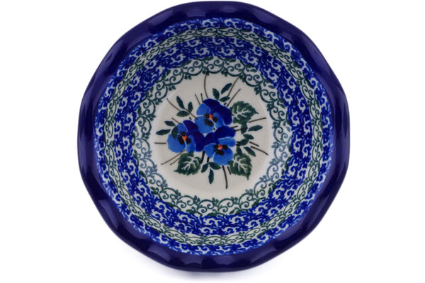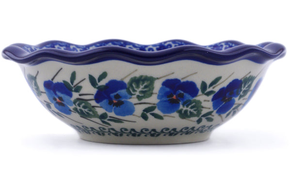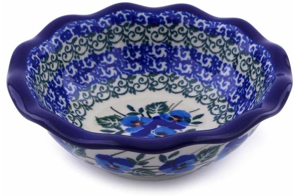 This Polish pottery Bowl is made by Ceramika Artystyczna workshop in Boleslawiec, Poland. Manufacturer item number H0946J. It is 1¾" high and measures 5" by 5". The capacity of this Bowl is 6.4 oz when filled to rim and it weighs 0.5 lbs. It is part of the Blue Pansy Collection.