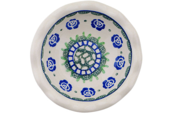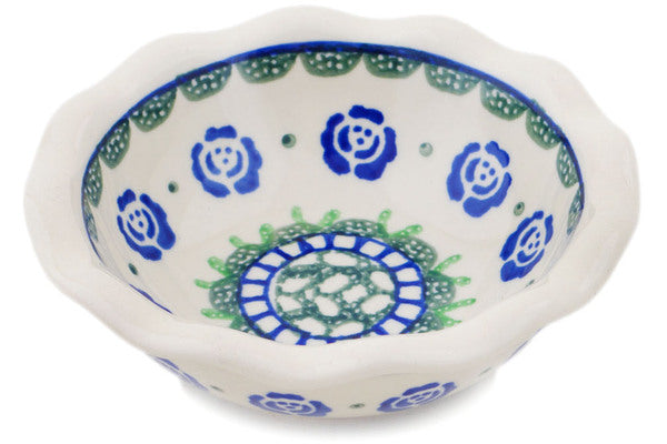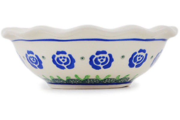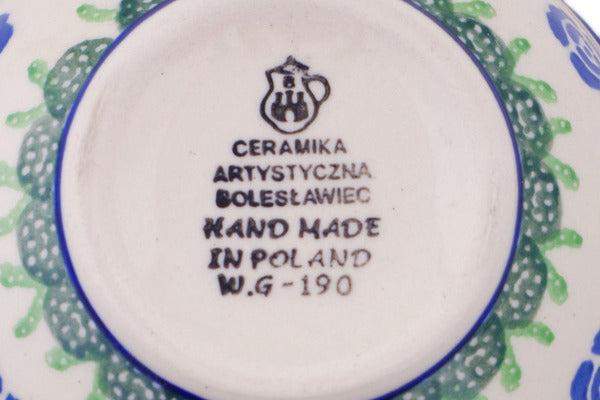 This Polish pottery Bowl is made by Ceramika Artystyczna workshop in Boleslawiec, Poland. Manufacturer item number H5369Q. It is 1¾" high and measures 5" by 5". The capacity of this Bowl is 6.4 oz when filled to rim and it weighs 0.5 lbs. The pattern was designed by artist Teresa Liana. It is part of the Blue Rose Patch Collection.