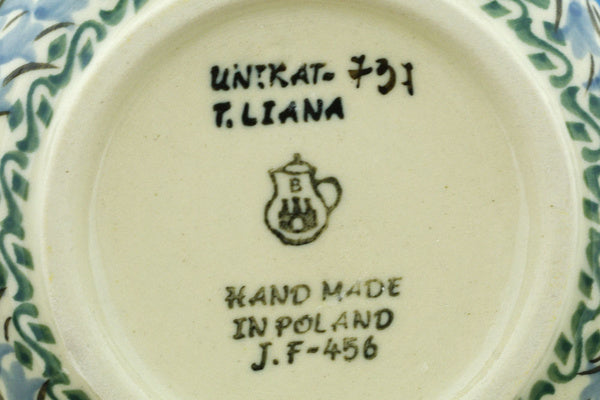 This Polish pottery Bowl is made by Ceramika Artystyczna workshop in Boleslawiec, Poland. Manufacturer item number H8675H. It is 2" high and measures 4¾" by 4¾". The capacity of this Bowl is 11.8 oz when filled to rim and it weighs 0.6 lbs. The pattern was designed by artist Teresa Liana. It is part of the Blue Rose Trellis Collection.