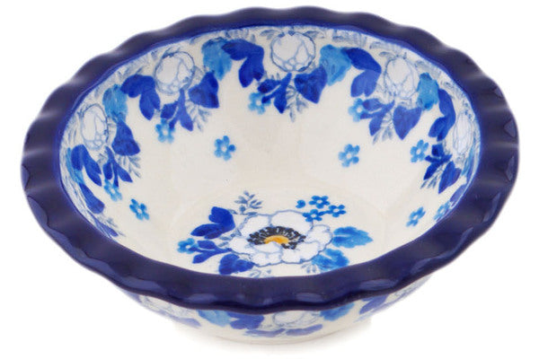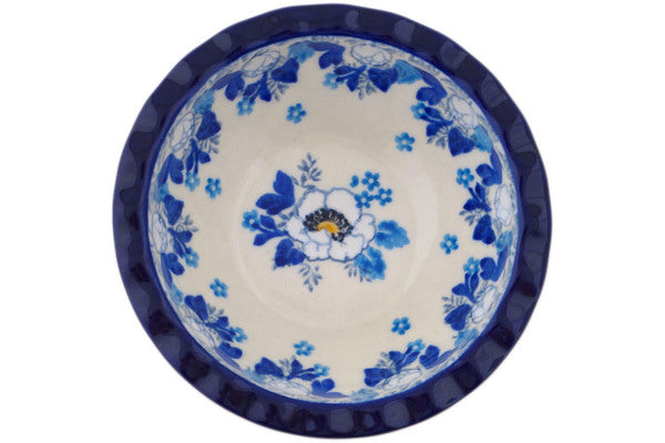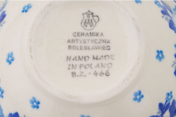 This Polish pottery Bowl is made by Ceramika Artystyczna workshop in Boleslawiec, Poland. Manufacturer item number H9495Q. It is 1½" high and measures 5" by 5". The capacity of this Bowl is 3.4 oz when filled to rim and it weighs 0.5 lbs. It is part of the Blue Spring Collection.