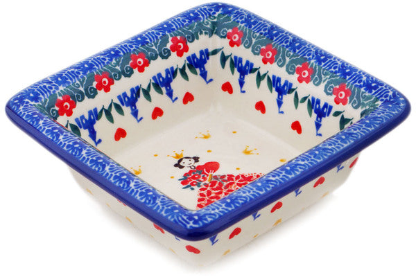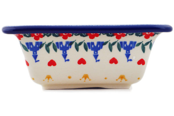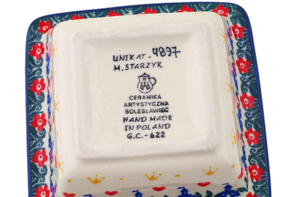 This Polish pottery Bowl is made by Ceramika Artystyczna workshop in Boleslawiec, Poland. Manufacturer item number H2416Q. It is 2" high and measures 5" by 5". The capacity of this Bowl is 5.9 oz when filled to rim and it weighs 0.8 lbs. The pattern was designed by artist MARIA STARZYK. It is part of the Cute As A Button Collection.