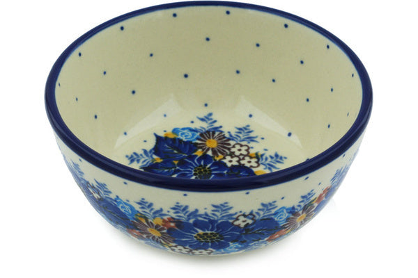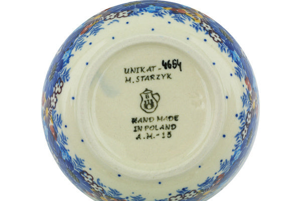 This Polish pottery Bowl is made by Ceramika Artystyczna workshop in Boleslawiec, Poland. Manufacturer item number H2823H. It is 2" high and measures 4¾" by 4¾". The capacity of this Bowl is 11.8 oz when filled to rim and it weighs 0.6 lbs. The pattern was designed by artist Maria Starzyk. It is part of the Flower Wreath Collection.