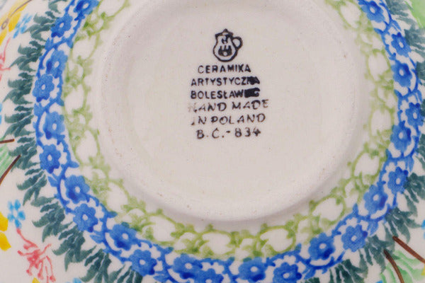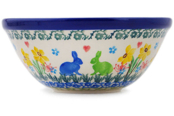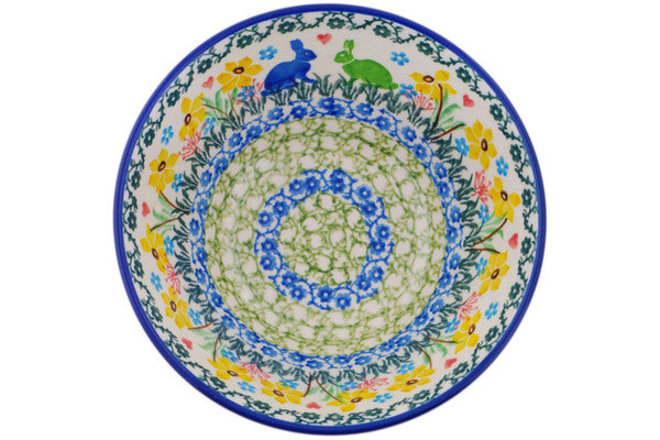 This Polish pottery Bowl is made by Ceramika Artystyczna workshop in Boleslawiec, Poland. Manufacturer item number H9048Q. It is 2¼" high and measures 5½" by 5½". The capacity of this Bowl is 12.7 oz when filled to rim and it weighs 0.7 lbs. It is part of the Hopping In Love Collection.