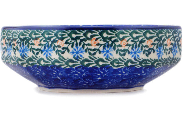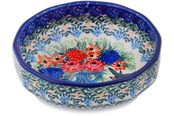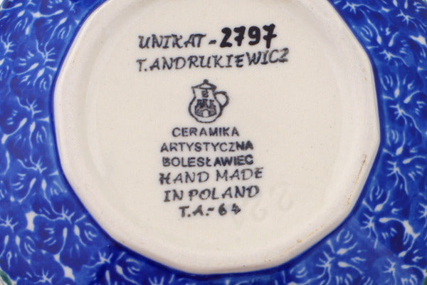 This Polish pottery Bowl is made by Ceramika Artystyczna workshop in Boleslawiec, Poland. Manufacturer item number H6660Q. It is 1¾" high and measures 5" by 5". The weight of this Bowl is 0.6 lbs. The pattern was designed by artist Teresa Andrukiewicz. It is part of the Hummingbird Bouquet Collection.