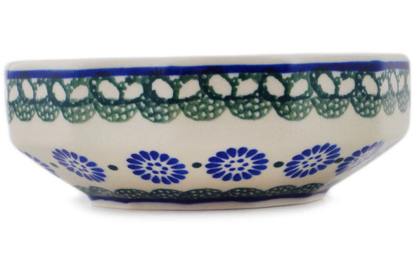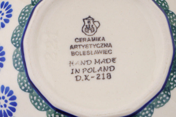 This Polish pottery Bowl is made by Ceramika Artystyczna workshop in Boleslawiec, Poland. Manufacturer item number H5127Q. It is 1¾" high and measures 5" by 5". The weight of this Bowl is 0.6 lbs. The pattern was designed by artist Teresa Liana. It is part of the Maia Collection.