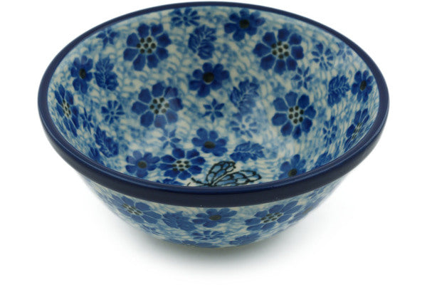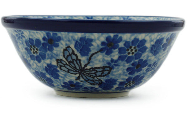 This Polish pottery Bowl is made by Ceramika Artystyczna workshop in Boleslawiec, Poland. Manufacturer item number H1774E. It is 2" high and measures 4¾" by 4¾". The capacity of this Bowl is 8.4 oz when filled to rim and it weighs 0.5 lbs. The pattern was designed by artist Teresa Liana. It is part of the Misty Dragonfly Collection.
