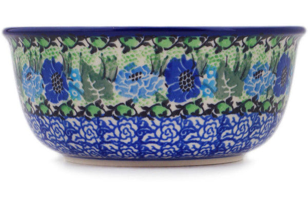 This Polish pottery Bowl is made by Ceramika Artystyczna workshop in Boleslawiec, Poland. Manufacturer item number H6915Q. It is 2¼" high and measures 5" by 5". The capacity of this Bowl is 11.0 oz when filled to rim and it weighs 0.6 lbs. The pattern was designed by artist Maria Starzyk. It is part of the Moody Blues Collection.