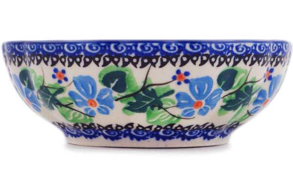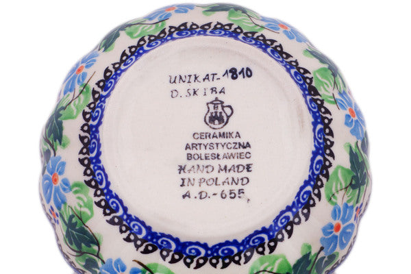 This Polish pottery Scalloped Fluted Bowl is made by Ceramika Artystyczna workshop in Boleslawiec, Poland. Manufacturer item number H0170G. It is 1½" high and measures 4¾" by 4¾". The capacity of this Scalloped Fluted Bowl is 8.4 oz when filled to rim and it weighs 0.5 lbs. The pattern was designed by artist Danuta Skiba. It is part of the Morning Glory Wreath Collection.
