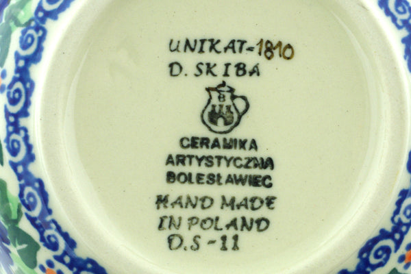This Polish pottery Bowl is made by Ceramika Artystyczna workshop in Boleslawiec, Poland. Manufacturer item number H9588A. It is 2" high and measures 4¾" by 4¾". The capacity of this Bowl is 11.8 oz when filled to rim and it weighs 0.6 lbs. The pattern was designed by artist Danuta Skiba. It is part of the Morning Glory Wreath Collection.