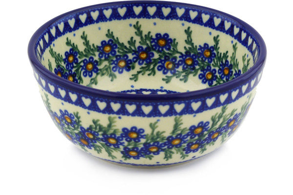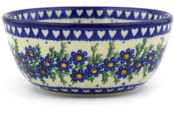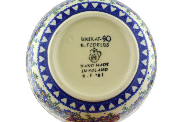 This Polish pottery Bowl is made by Ceramika Artystyczna workshop in Boleslawiec, Poland. Manufacturer item number H5658E. It is 2" high and measures 4¾" by 4¾". The capacity of this Bowl is 11.8 oz when filled to rim and it weighs 0.6 lbs. The pattern was designed by artist Barbara Fidelus. It is part of the Mother's Love Collection.