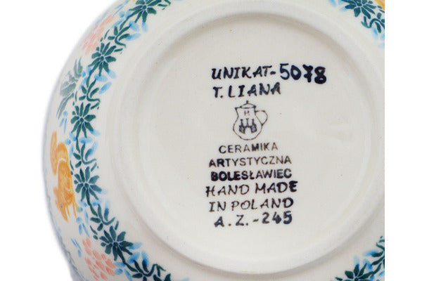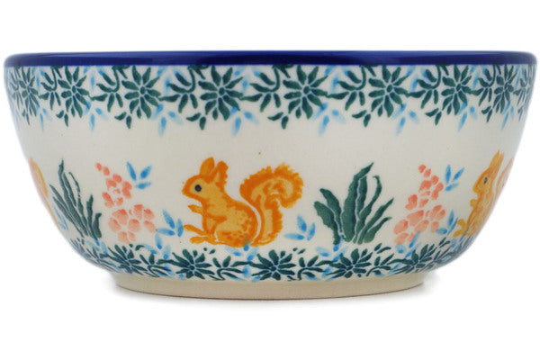 This Polish pottery Bowl is made by Ceramika Artystyczna workshop in Boleslawiec, Poland. Manufacturer item number H3876O. It is 2" high and measures 4¾" by 4¾". The capacity of this Bowl is 11.8 oz when filled to rim and it weighs 0.6 lbs. It is part of the Nuts About You Collection.