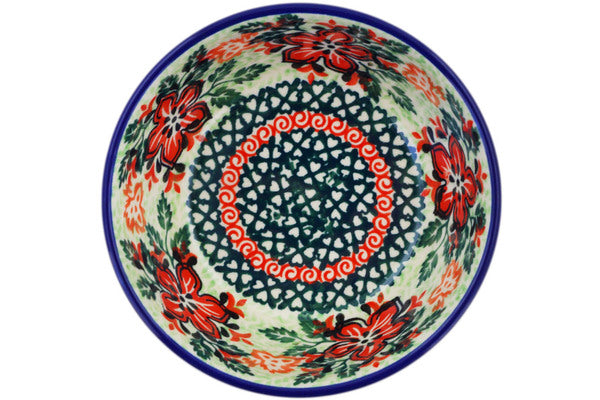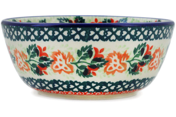 This Polish pottery Bowl is made by Ceramika Artystyczna workshop in Boleslawiec, Poland. Manufacturer item number H2488L. It is 2" high and measures 4¾" by 4¾". The capacity of this Bowl is 11.8 oz when filled to rim and it weighs 0.6 lbs. The pattern was designed by artist Krystyna Dacyszyn. It is part of the Painting In The Garden Collection.