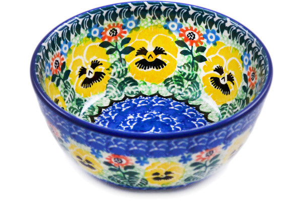 This Polish pottery Bowl is made by Ceramika Artystyczna workshop in Boleslawiec, Poland. Manufacturer item number H4012L. It is 2" high and measures 4¾" by 4¾". The capacity of this Bowl is 11.8 oz when filled to rim and it weighs 0.6 lbs. The pattern was designed by artist Maria Starzyk. It is part of the Pansies Field Collection.
