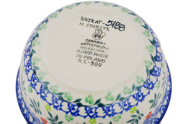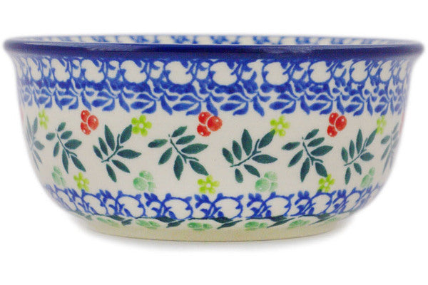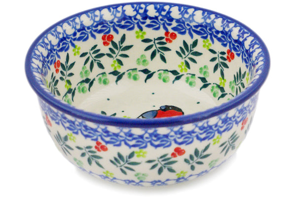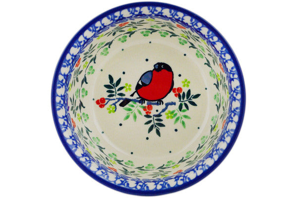 This Polish pottery Bowl is made by Ceramika Artystyczna workshop in Boleslawiec, Poland. Manufacturer item number H1675R. It is 2¼" high and measures 5" by 5". The capacity of this Bowl is 11.0 oz when filled to rim and it weighs 0.6 lbs. It is part of the Robin & Wren Collection.