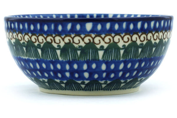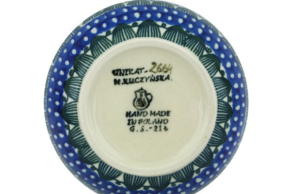 This Polish pottery Bowl is made by Ceramika Artystyczna workshop in Boleslawiec, Poland. Manufacturer item number H1959H. It is 2" high and measures 4¾" by 4¾". The capacity of this Bowl is 11.8 oz when filled to rim and it weighs 0.6 lbs. The pattern was designed by artist Monika Kuczyńska. It is part of the Rooster Row Collection.