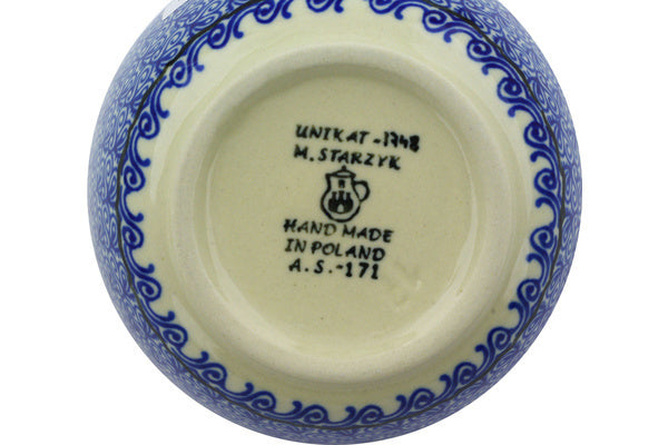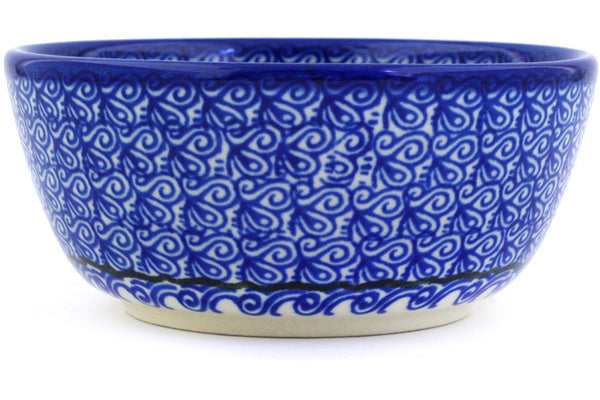 This Polish pottery Bowl is made by Ceramika Artystyczna workshop in Boleslawiec, Poland. Manufacturer item number H8480D. It is 2" high and measures 4¾" by 4¾". The capacity of this Bowl is 11.8 oz when filled to rim and it weighs 0.6 lbs. The pattern was designed by artist Maria Starzyk. It is part of the Sea Of Posies Collection.