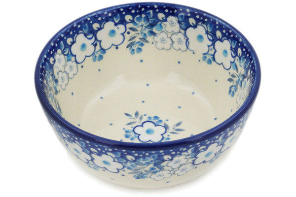 This Polish pottery Bowl is made by Ceramika Artystyczna workshop in Boleslawiec, Poland. Manufacturer item number H0075L. It is 2" high and measures 4¾" by 4¾". The capacity of this Bowl is 11.8 oz when filled to rim and it weighs 0.6 lbs. The pattern was designed by artist MARIA STARZYK. It is part of the Sky Full Of Flowers Collection.