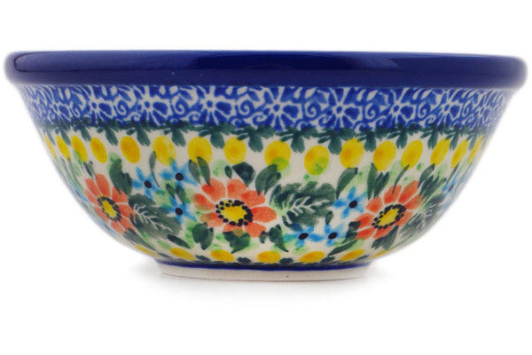 This Polish pottery Bowl is made by Ceramika Artystyczna workshop in Boleslawiec, Poland. Manufacturer item number H6780Q. It is 2" high and measures 4¾" by 4¾". The capacity of this Bowl is 8.4 oz when filled to rim and it weighs 0.5 lbs. The pattern was designed by artist Teresa Liana. It is part of the Solo Hummingbird Collection.
