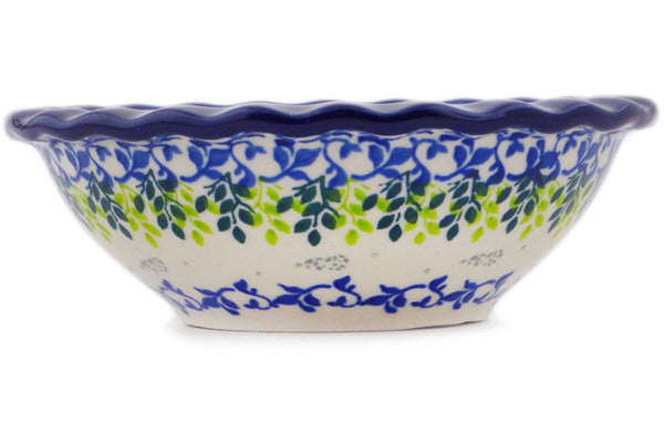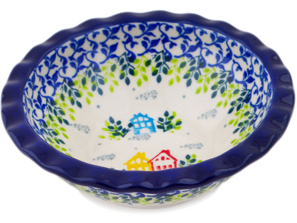 This Polish pottery Bowl is made by Ceramika Artystyczna workshop in Boleslawiec, Poland. Manufacturer item number H2470Q. It is 1½" high and measures 5" by 5". The capacity of this Bowl is 3.4 oz when filled to rim and it weighs 0.5 lbs. The pattern was designed by artist MARIA STARZYK. It is part of the Sweet Little Village Collection.