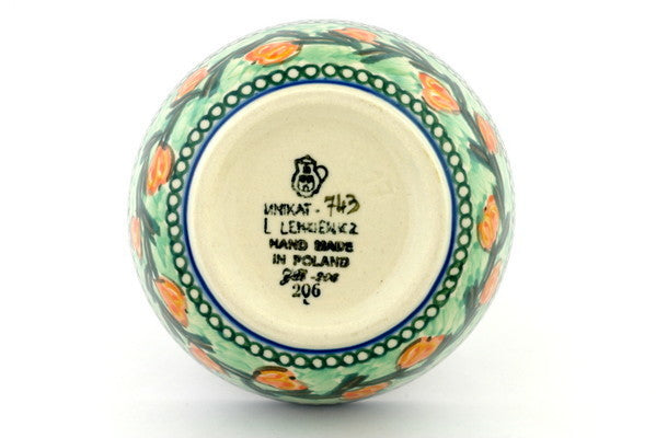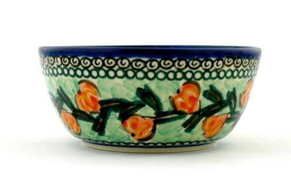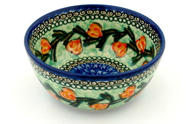This Polish pottery Bowl is made by Ceramika Artystyczna workshop in Boleslawiec, Poland. Manufacturer item number H2655A. It is 2" high and measures 4¾" by 4¾". The capacity of this Bowl is 11.8 oz when filled to rim and it weighs 0.6 lbs. The pattern was designed by artist Lucyna Lenkiewicz. It is part of the Tulip Wreath Collection.