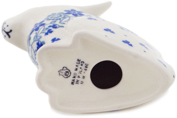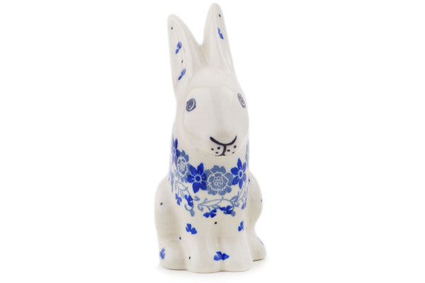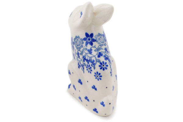 This Polish pottery Bunny Figurine is made by Ceramika Artystyczna workshop in Boleslawiec, Poland. Manufacturer item number H0355Q. It is 5" high and measures 4¼" by 2". The weight of this Bunny Figurine is 0.4 lbs. The pattern was designed by artist Maria Starzyk. It is part of the Blue Country Field Collection.