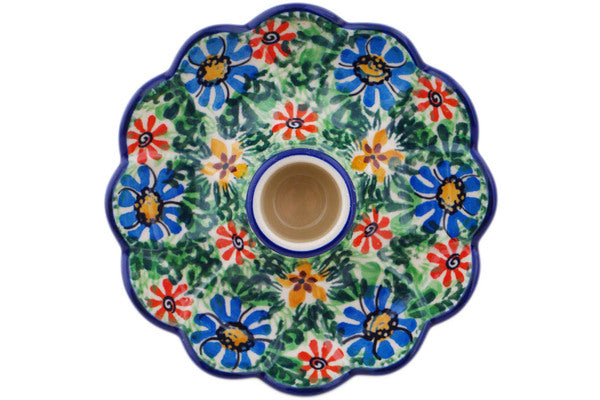 This Polish pottery Candle Holder is made by Ceramika Artystyczna workshop in Boleslawiec, Poland. Manufacturer item number H8231O. It is 1¾" high and measures 5" by 5". The weight of this Candle Holder is 0.5 lbs. The pattern was designed by artist Jolanta Okraska. It is part of the Profusion Collection.