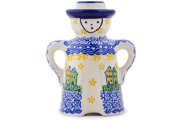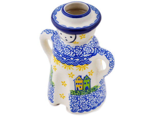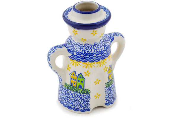This Polish pottery Candle Holder is made by Ceramika Artystyczna workshop in Boleslawiec, Poland. Manufacturer item number H3325Q. It is 5" high and measures 4" by 2½". The weight of this Candle Holder is 0.6 lbs. The pattern was designed by artist MARIA STARZYK. It is part of the Riverside Village Collection.