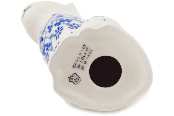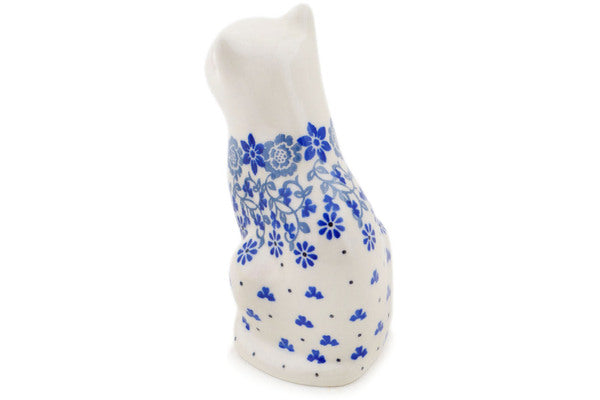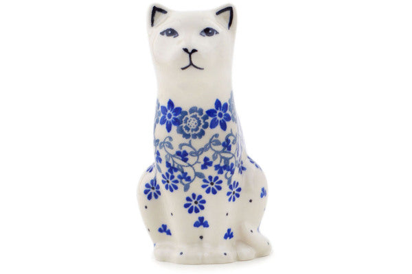 This Polish pottery Cat Figurine is made by Ceramika Artystyczna workshop in Boleslawiec, Poland. Manufacturer item number H0350Q. It is 5" high and measures 3¾" by 2½". The weight of this Cat Figurine is 0.3 lbs. The pattern was designed by artist Maria Starzyk. It is part of the Blue Country Field Collection.