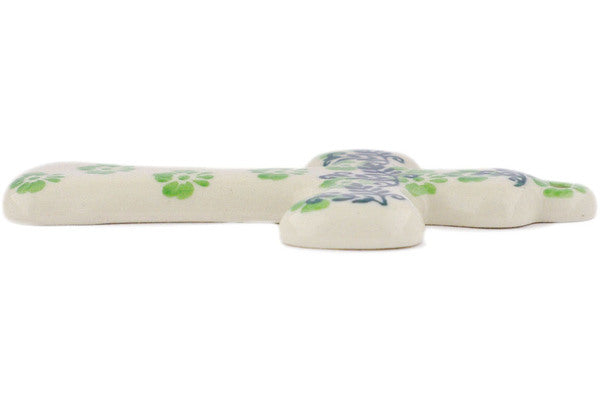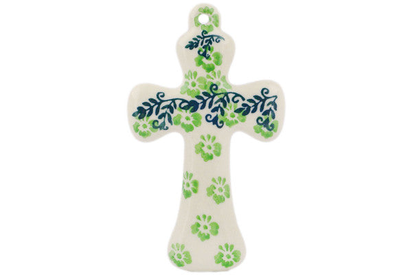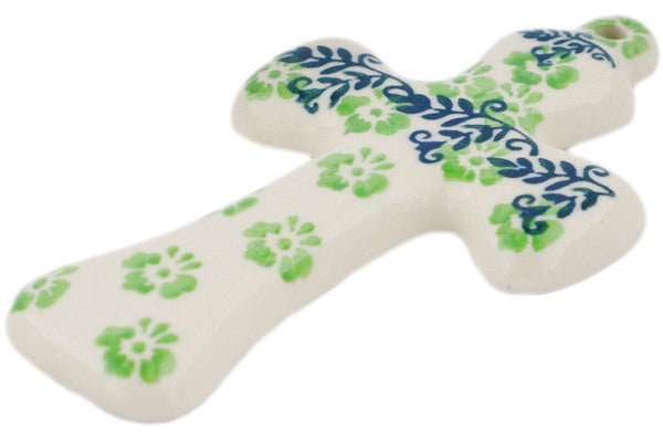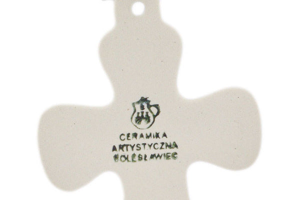 This Polish pottery Cross is made by Ceramika Artystyczna workshop in Boleslawiec, Poland. Manufacturer item number H6236Q. It is ½" high and measures 4¾" by 2¾". The weight of this Cross is 0.2 lbs. The pattern was designed by artist Krystyna Dacyszyn.