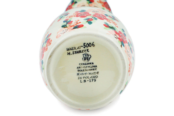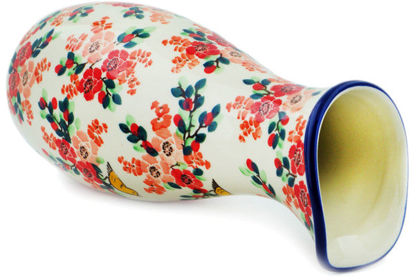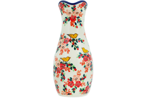 This Polish pottery Carafe is made by Ceramika Artystyczna workshop in Boleslawiec, Poland. Manufacturer item number H9961L. It is 10½" high and measures 4½" by 3¾". The capacity of this Carafe is 43.8 oz when filled to rim and it weighs 1.9 lbs. The pattern was designed by artist MARIA STARZYK. It is part of the Golden Sparrow In Rosy Petals Collection.