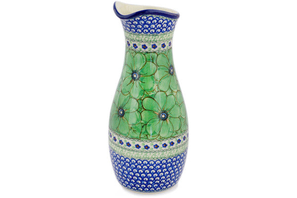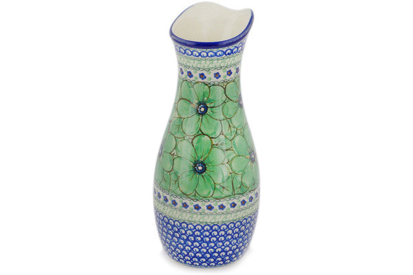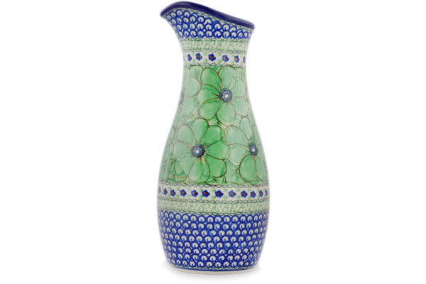 This Polish pottery Carafe is made by Ceramika Artystyczna workshop in Boleslawiec, Poland. Manufacturer item number H3539R. It is 10½" high and measures 4½" by 3¾". The capacity of this Carafe is 43.8 oz when filled to rim and it weighs 1.9 lbs. The pattern was designed by artist Jacek Chyla. It is part of the Green Pansies Collection.