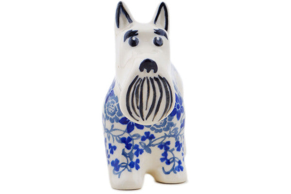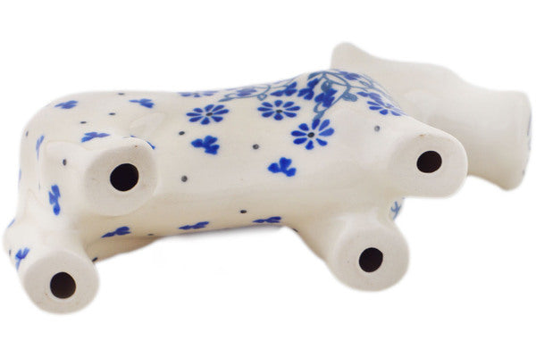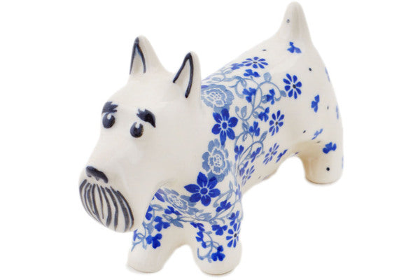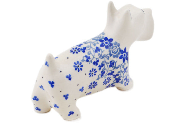 This Polish pottery Dog Figurine is made by Ceramika Artystyczna workshop in Boleslawiec, Poland. Manufacturer item number H0351Q. It is 3½" high and measures 5¼" by 1½". The weight of this Dog Figurine is 0.3 lbs. The pattern was designed by artist Maria Starzyk. It is part of the Blue Country Field Collection.