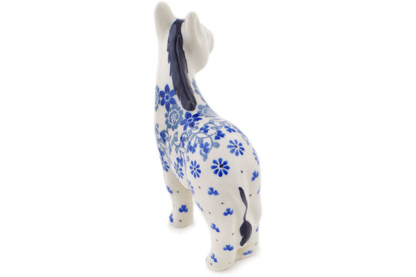 This Polish pottery Donkey Figurine is made by Ceramika Artystyczna workshop in Boleslawiec, Poland. Manufacturer item number H0371Q. It is 5" high and measures 5" by 2¼". The weight of this Donkey Figurine is 0.4 lbs. The pattern was designed by artist Maria Starzyk. It is part of the Blue Country Field Collection.