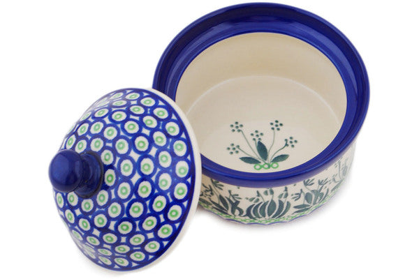 This Polish pottery Jar with Lid is made by Ceramika Artystyczna workshop in Boleslawiec, Poland. Manufacturer item number H2691Q. It is 5" high and measures 5¼" by 5¼". The capacity of this Jar with Lid is 16.5 oz when filled to rim and it weighs 1.1 lbs. The pattern was designed by artist Maria Ciszewska. It is part of the Weeping Tulips Collection.